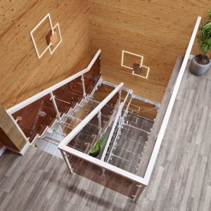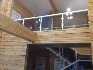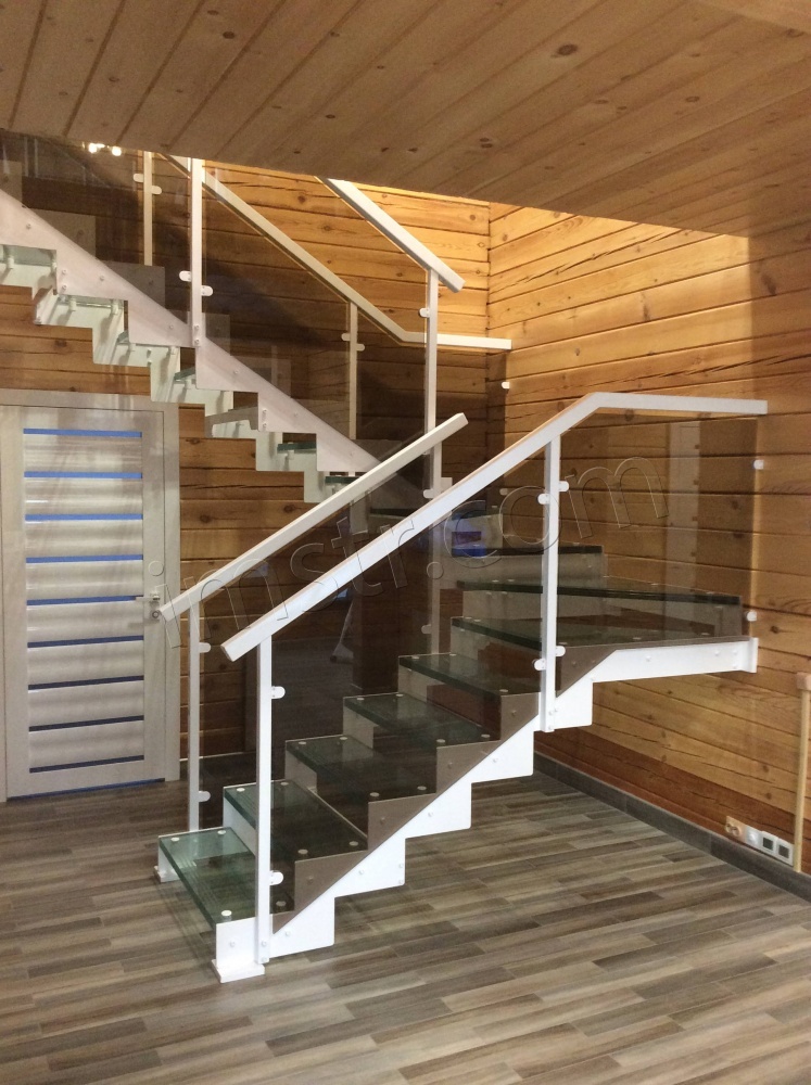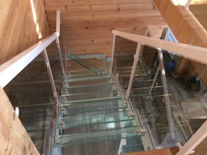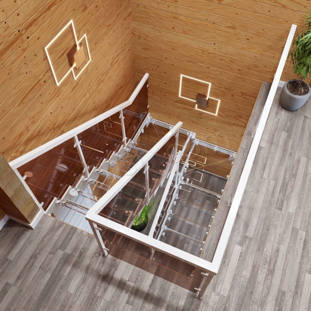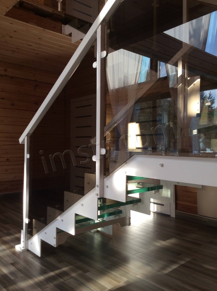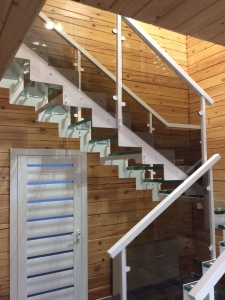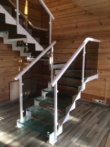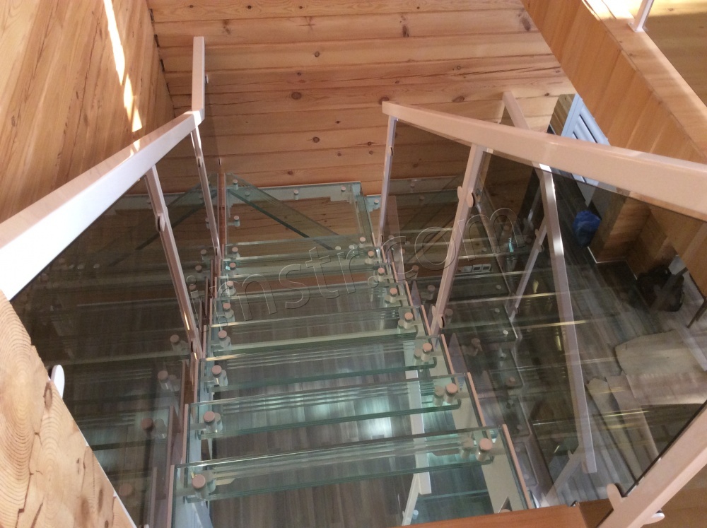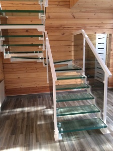 Лестница со стеклянными ступенями и перилами. Ступени из стекла триплекс, перила - каленое стекло и деревянные березовые поручни. Роскошная лестница премиум класса для тех , кто ценит качество и красоту.