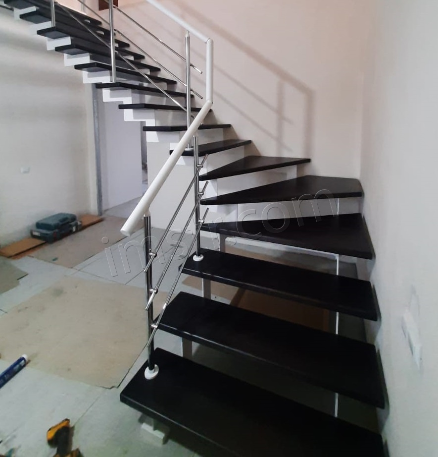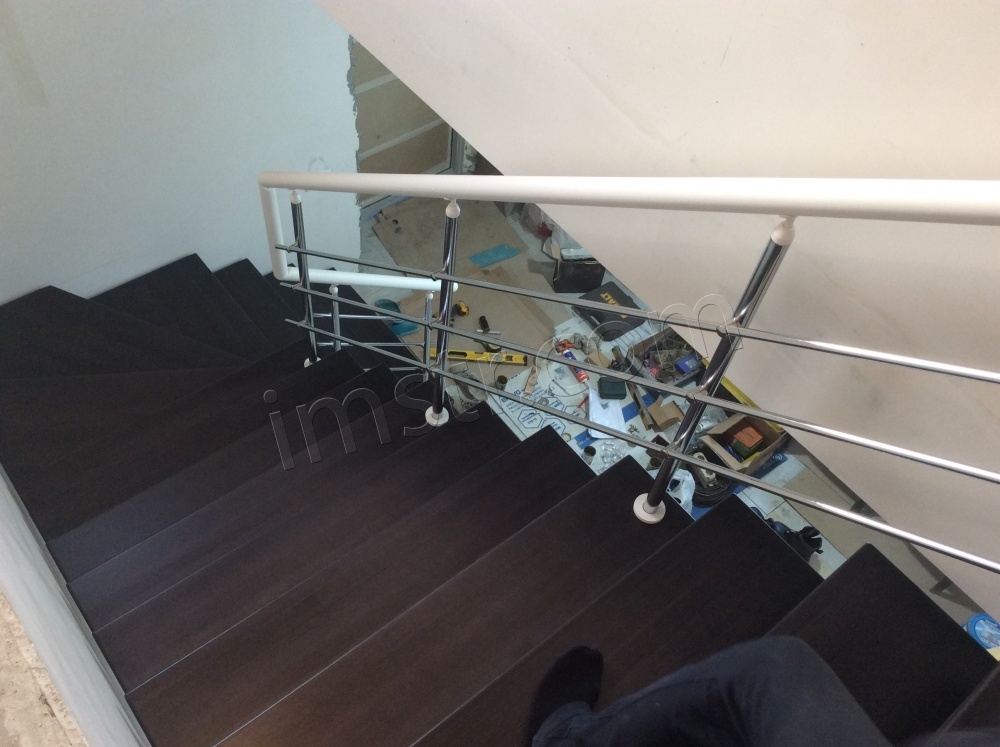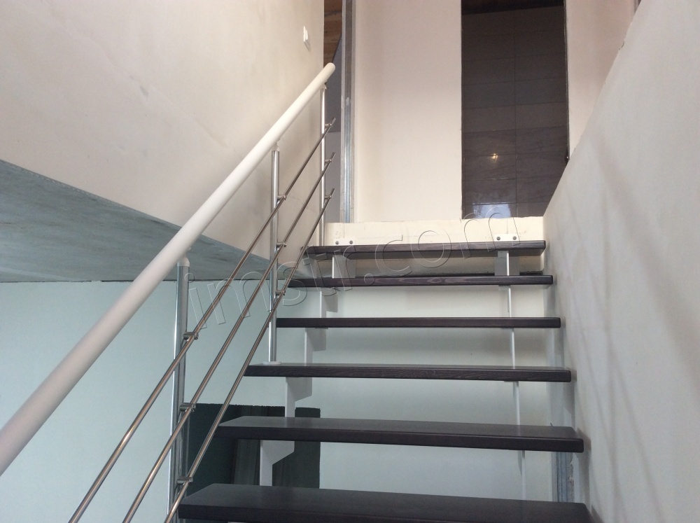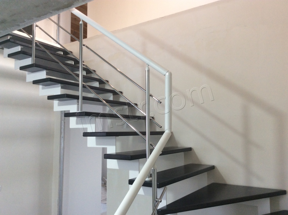 Лестница с хромированными перилами "Милена 5" в бело-серой гамме - отличный выбор для загородного современного коттеджа. Косоур лазерной резки с полимерным покрытием цвет "белый муар", ступени из сосны серого цвета.